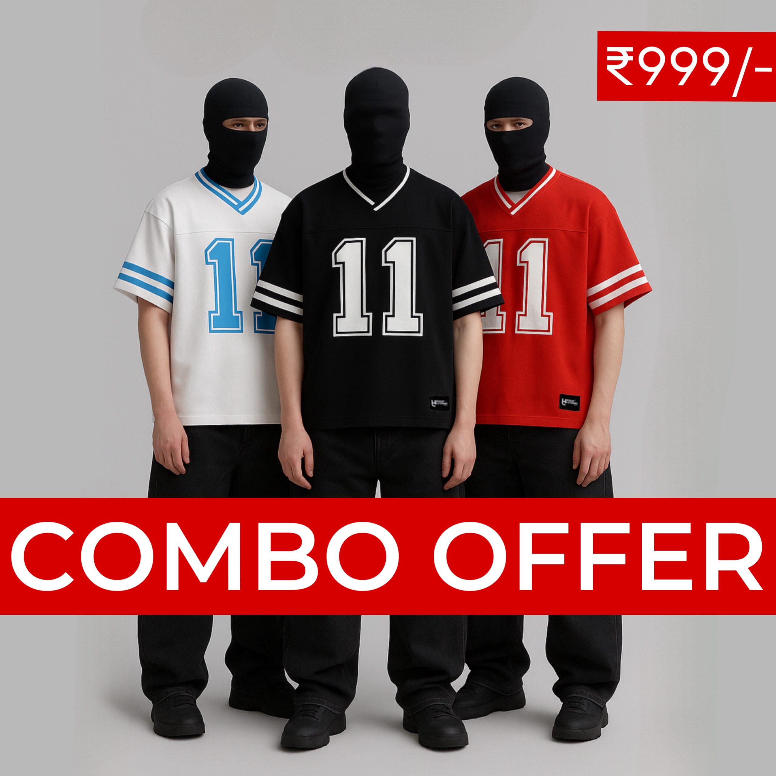 for just ₹999/- Get three jerseys in different colors – black, off-white, and red,
